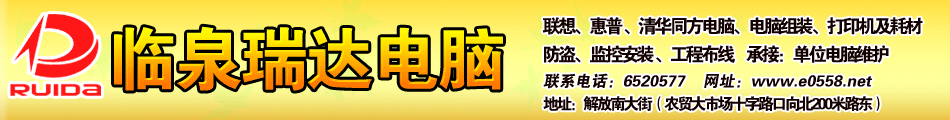 联系地址:解放南大街(皖浙农贸市场十字路口向北100米路西 金黄山鲜果园对面)临泉瑞达电脑
